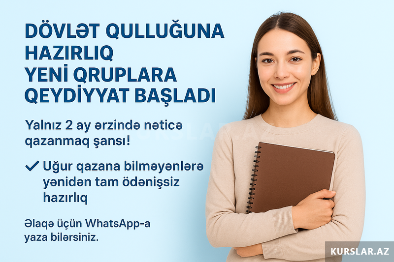 Dövlət qulluğuna qəbul olmaq istəyirsinizsə, bu proqram sizin üçün ən doğru seçimdir. Yalnız 2 ay ərzində yüksək nəticə əldə etmək və həm test, həm də müsahibə mərhələsini uğurla keçmək mümkündür. Tədris prosesi dövlət qulluğu imtahanlarının real formatına tam uyğun şəkildə hazırlanıb.