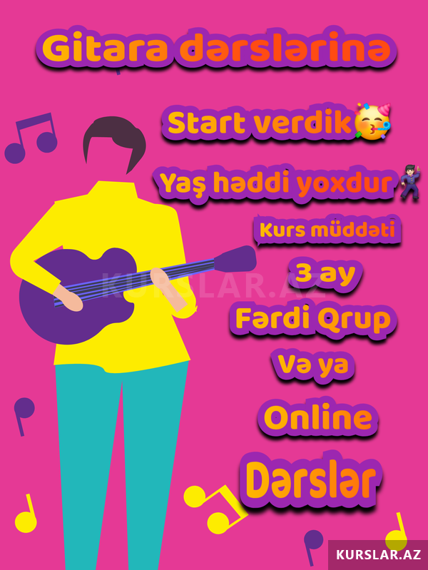 Təcrübəli müəllim tərəfindən aparılan dərslər sayəsində siz qısa zamanda öz ifa tərzinizi formalaşdıra biləcəksiniz. Kursu bitirən hər bir iştirakçıya diplom təqdim olunur. Gitara öyrənmək istəyirsiniz, lakin dərslərə canlı şəkildə qatılmaq imkanınız yoxdursa, online dərslərə rahatlıqla qoşula bilərsiniz.