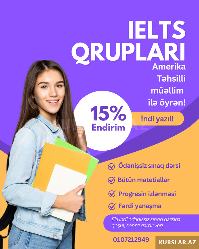 Hazırda IELTS üzrə sistemli hazırlıq aparılan qrup dərslərimə qoşulmaq mümkündür və dərs prosesi hər tələbənin inkişafını izləməyə yönəlib. Tədris prosesində bütün bölmələr üzrə biliklərin formalaşdırılması, fərdi yanaşma və lazımi materiallarla dəstək təmin olunur. İlk mərhələdə dərs formatını tanımaq üçün ödənişsiz demo dərsə qoşulmaq imkanı verilir.