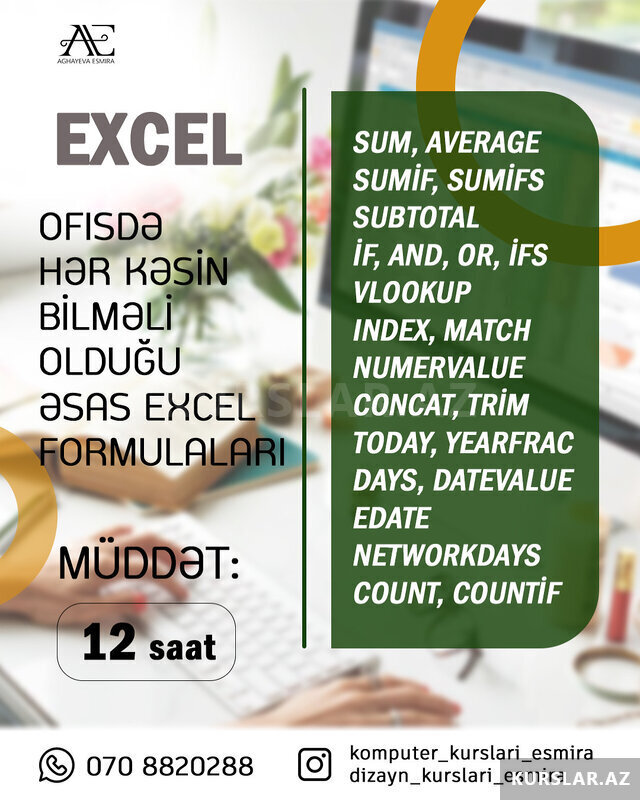 Kompüter bacarıqlarını inkişaf etdirmək və rəqəmsal mühitdə peşəkar səviyyəyə yüksəlmək istəyirsənsə, bu kurs sənin üçün ən doğru seçimdir. Təcrübəli müəllim tərəfindən keçirilən dərslər praktiki yanaşma və fərdi diqqət sayəsində hər bir iştirakçının məqsədinə çatmasını təmin edir. Tədris proqramı genişdir və müasir iş bazarının tələblərinə tam uyğundur: