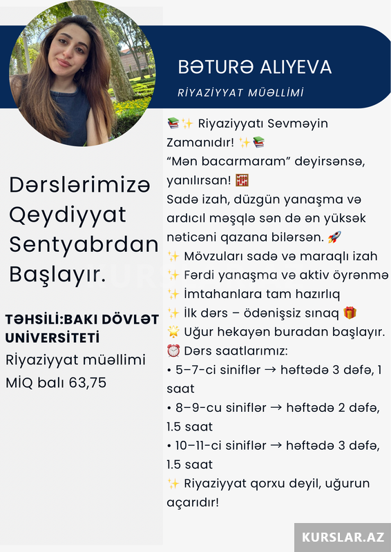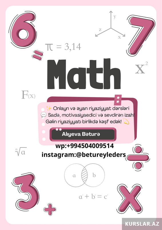 Riyaziyyat mövzularını sadə və sistemli şəkildə izah edən dərslərlə şagirdlər mövzunu addım-addım mənimsəyir. Qrup və fərdi dərslərdə materiallar aydın izah və ardıcıl məşqlərlə təqdim olunur.