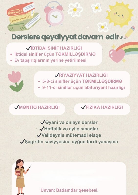 Dərslər şagirdin mövzunu real şəkildə başa düşməsi üçün sistemli və ardıcıl izah üzərində qurulur. Tədris prosesi fərqli sinif səviyyələrinə uyğun proqram və fərdi yanaşma ilə təşkil olunur.